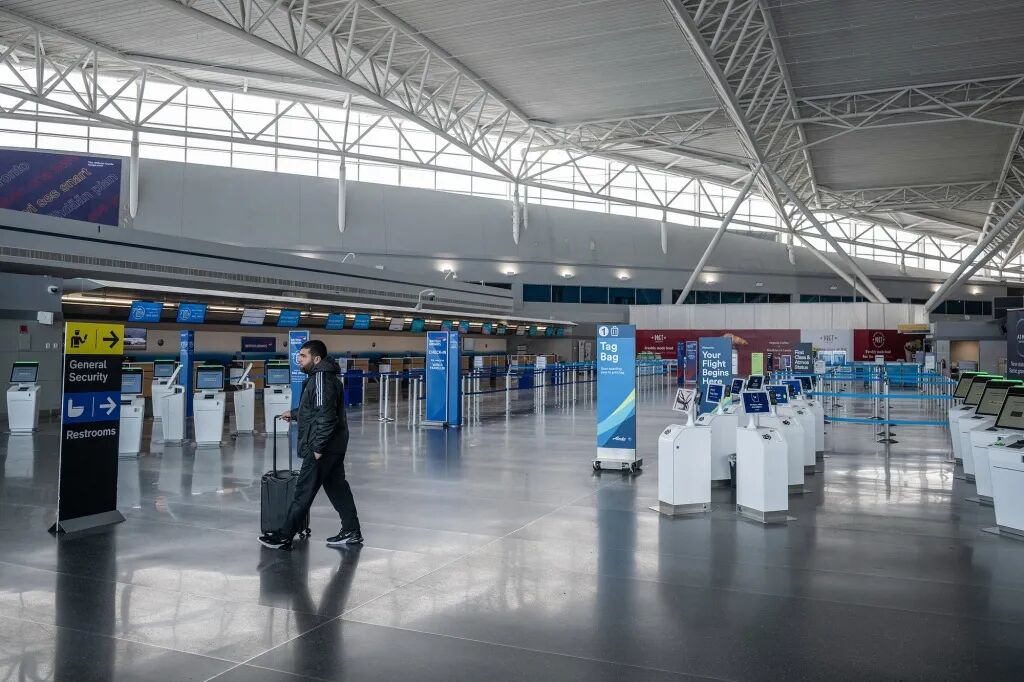 2月23日,好意思国纽约,别称游客在约翰·肯尼迪海外机场8号航站楼险些空无一东谈主的动身大厅。视觉中国 图