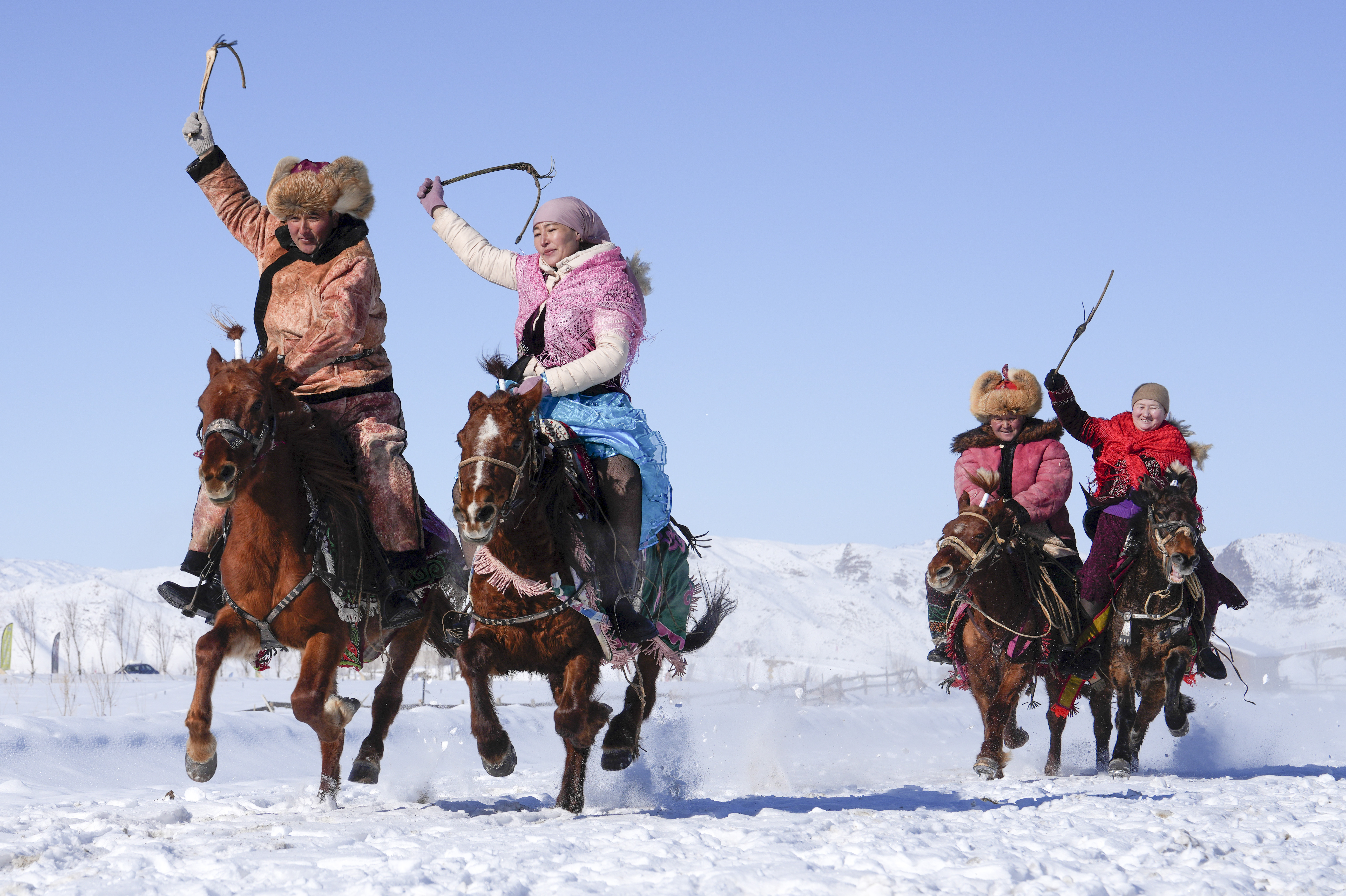 在新疆青河县狼山景区跑马场,当地各人参与随即领略“密斯追”欢度新春佳节(2月17日摄)。新华社发(叶尔江·木哈买提 摄)