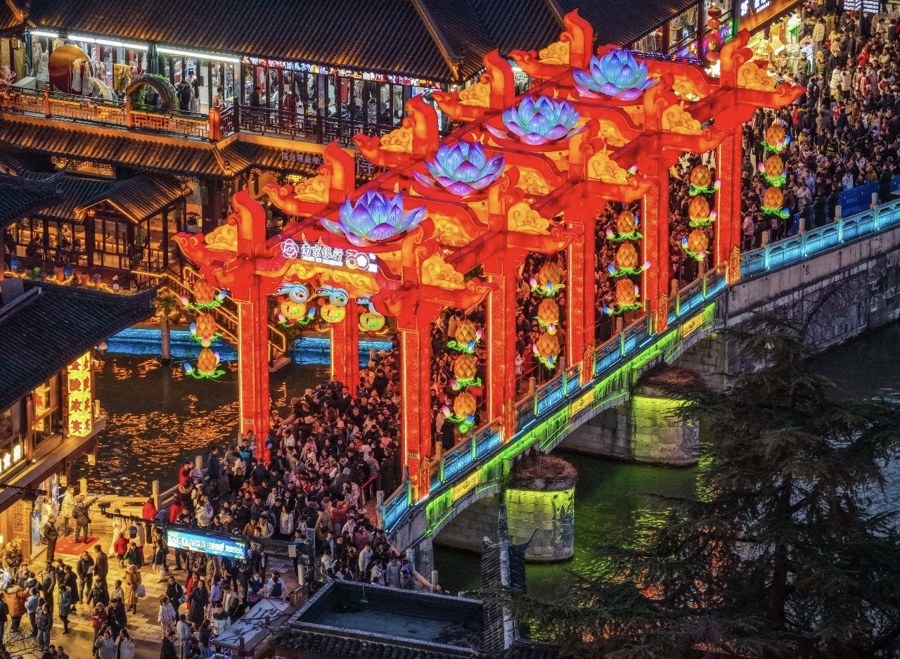 春节假期,夫子庙—秦淮形势带,好戏连台、客流如织。金陵长乐坊簇新亮相,秦淮灯会传承千年;大成殿前新春“财神巡游”,凤凰彩票官网app熙南里“货郎送花”;南京习惯博物馆老茶楼献技南京白局《织云记》,大酬报寺古迹景区推出“大未来团”新春巡游仪式;老门东调理系“大胖橘猫”花灯耸峙,中华门城墙上中外搭客竞相与“聚宝小蓝马”新春打卡装配合影……