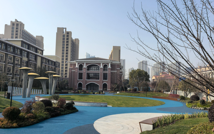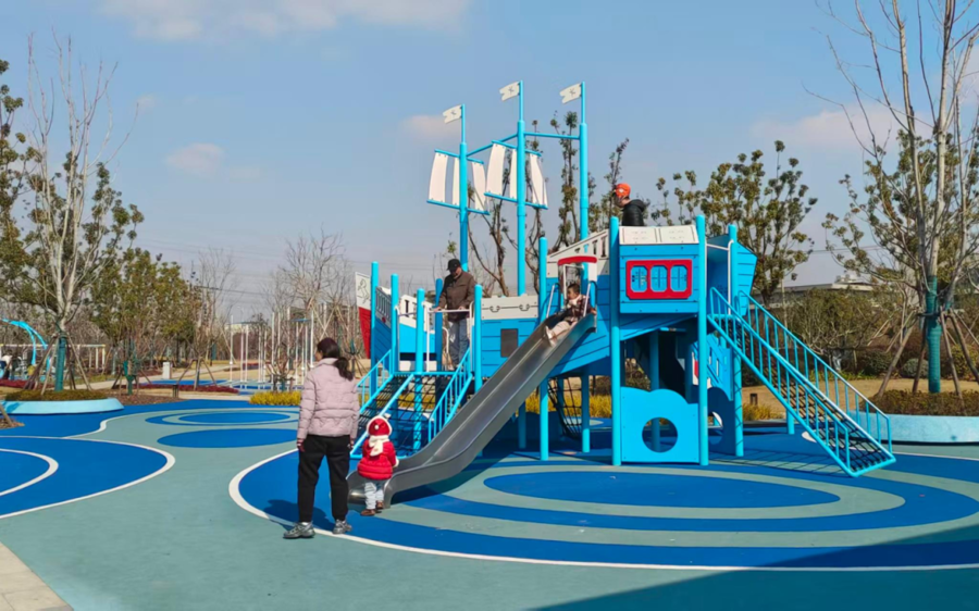 绿地中诞生了调节舒展的阳光大草坪、参差有致的乔灌植被组团,搭配彩叶灌木与不雅赏草境,形成了四季有景的生态基底。园内还诞生了以蓝色为主色系的儿童游乐区,囊括攀爬网、海盗船滑梯等措施。彩色健身步谈则串联全园,既得志通勤与清爽需求,又以蓝红撞色线条强化了当代活力感。
