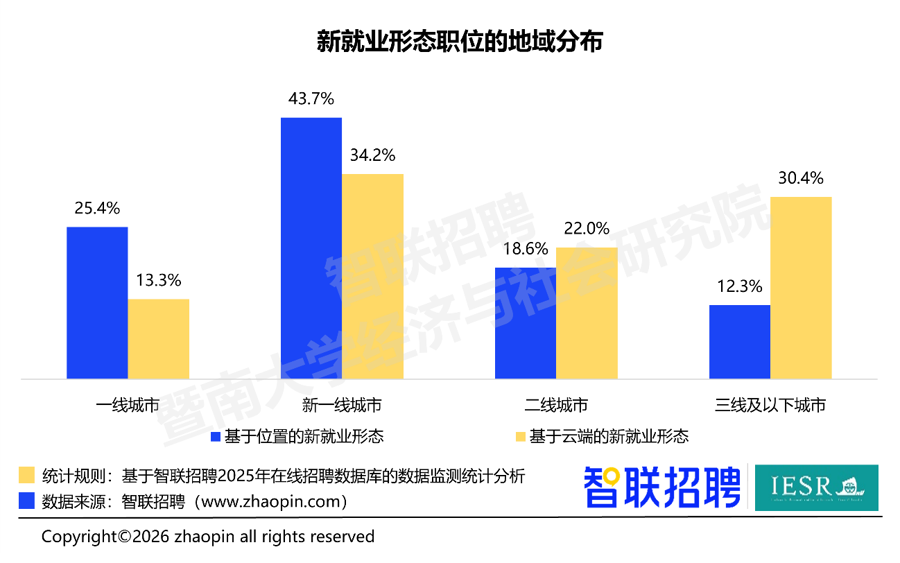 该文书由暨南大学经济与社会商酌院长入智联招聘发布,初度系统将新办事步地差别为“基于位置”和“基于云表”两大类型。数据闪现,2025年基于位置的新办事步地(如网约车、配送、活命服务)招聘职位高度商酌于一线和新一线城市,统共占比达69.1%;而基于云表的岗亭(如学问服务、新媒体、电商)则加快向三四线城市下千里,三线及以下城市招聘占比达30.4%。
