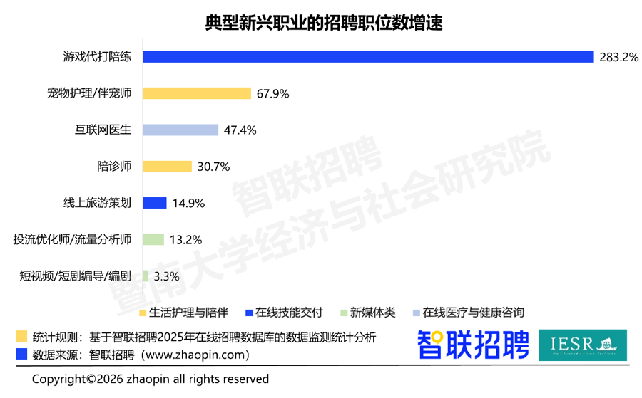 2025年,我国机动办事东说念主员界限已冲突2亿东说念主,新办事步地成为稳办事、促增收的漏洞渠说念。最新发布的《2025中国新办事步地文书》闪现,以前新办事步地招聘职位数同比增长15.1%,求职东说念主数增长11.0%,其中基于位置型岗亭职位数激增28.9%,陪诊师、宠物照顾/伴宠师、互联网医师等新兴职业需求迅猛增长,部分岗亭增速超60%以至近300%。