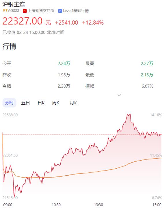 春节假期工夫,纽交所白银期货累计涨幅首先11%,位居大家主要巨额商品涨幅首位。2月24日,上海期货走动所白银期货主力一语气合约涨幅一度冲高至14%以上。截止收盘,沪银主连报22327元每千克,相较节前终末一个走动日高涨了12.84%。