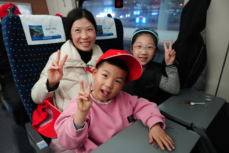 来自西安市周到县的务工东说念主员何淑利(左一)和女儿、犬子恭候列车发车。\n 新华社记者 邵瑞 摄