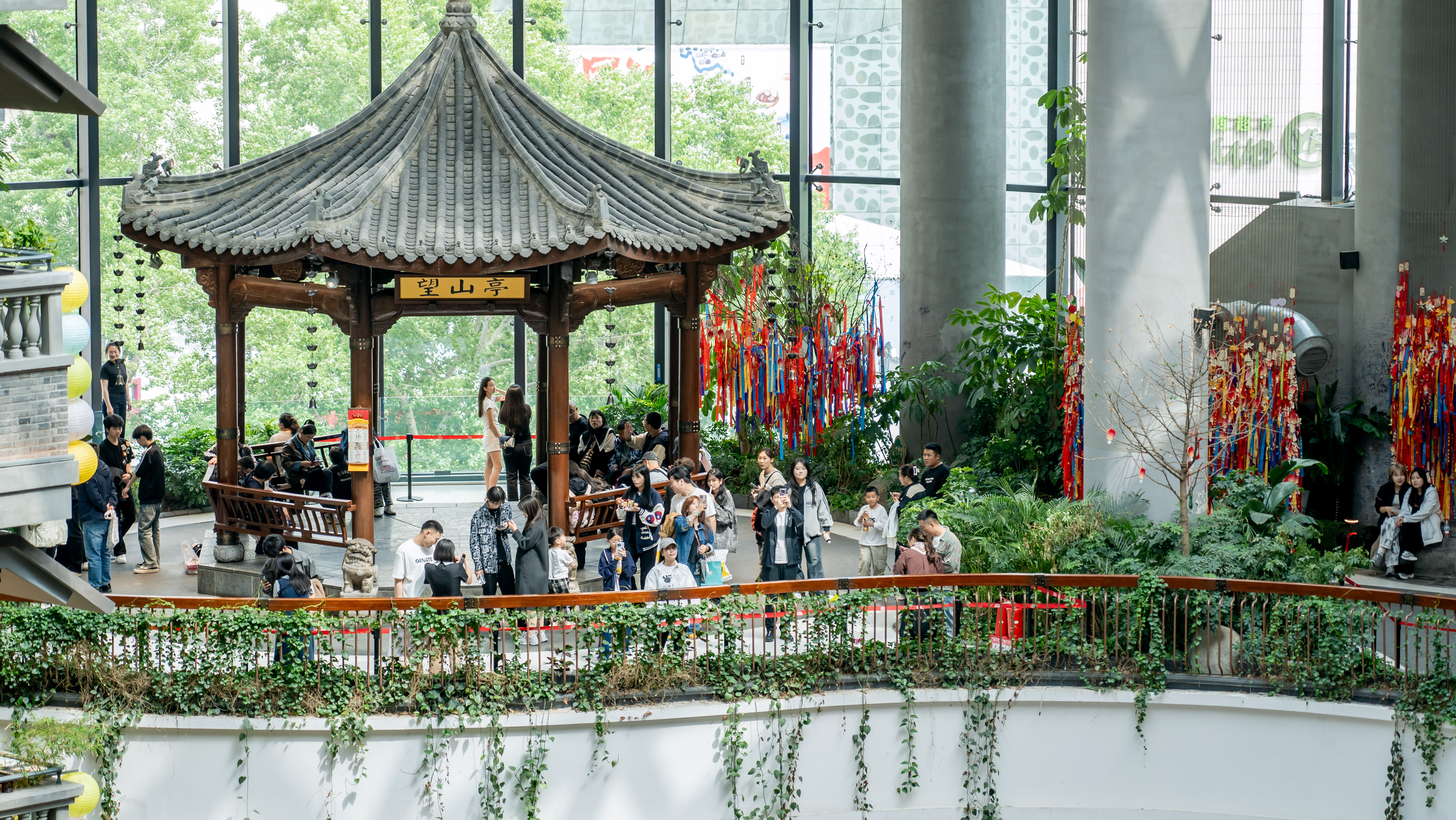 走进“这有山”,目下是一座高约30米的“山丘”——石阶转折朝上,街巷杂沓有致,亭台楼阁、种种小店存身其间,溪流潺潺声与游东谈主喧闹声交汇。200多家特质店铺依着“山势”杂沓排布,搭客拾级而上,方可开启“登山寻宝”之旅,解锁层层惊喜。